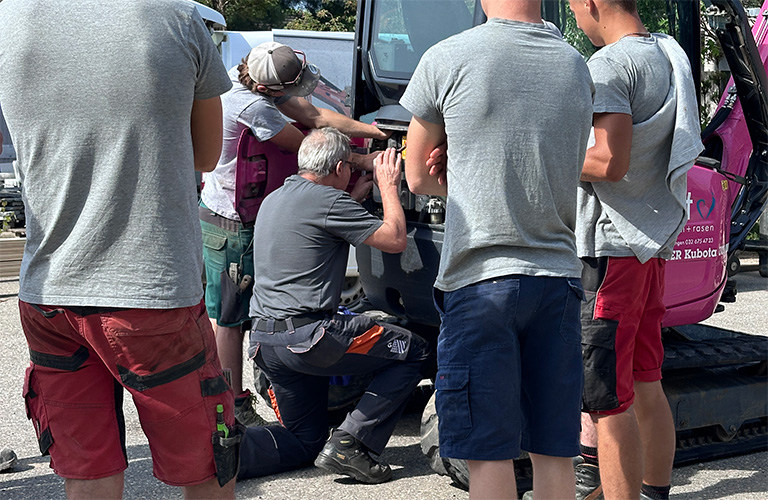 Denn Start machten wir mit Rejo von Niveltec, er erklärte uns wie der Tachimeter funktioniert und auf was zu achten ist. Weiter ging es mit der Firma Hutter, Martin Käser hat uns aufgezeigt wie bedeutsam die richtige und regelmässige Maschinenpflege ist. Vor dem Mittag erhielt das gesamte Team eine Vorführung moderner Hydrothermgeräte zur Reinigung von Belägen oder der Unkrautentfernung.