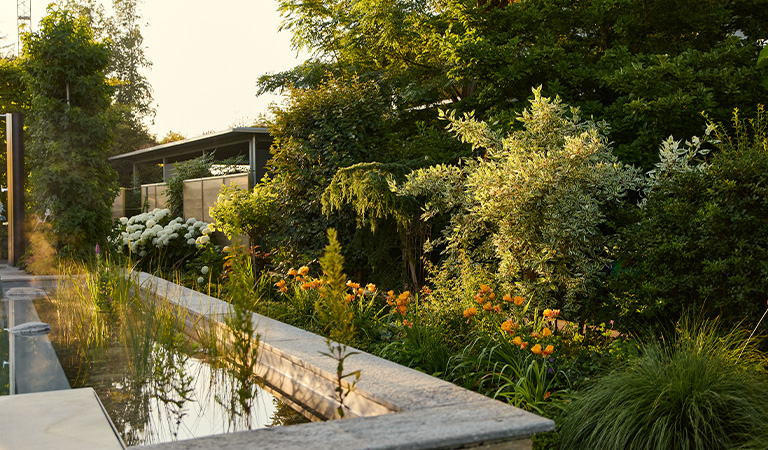 Naturpoolgarten mit Staudenpracht und moderner Technik