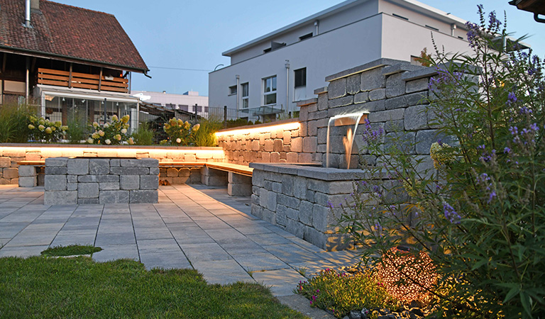 Das Ergebnis ist ein wunderschönes Ambiente, das vor allem am Abend durch das Zusammenspiel von Feuer, Wasser und hochwertigen Materialien beeindruckt, ein idealer Ort für gesellige Stunden im Freien.